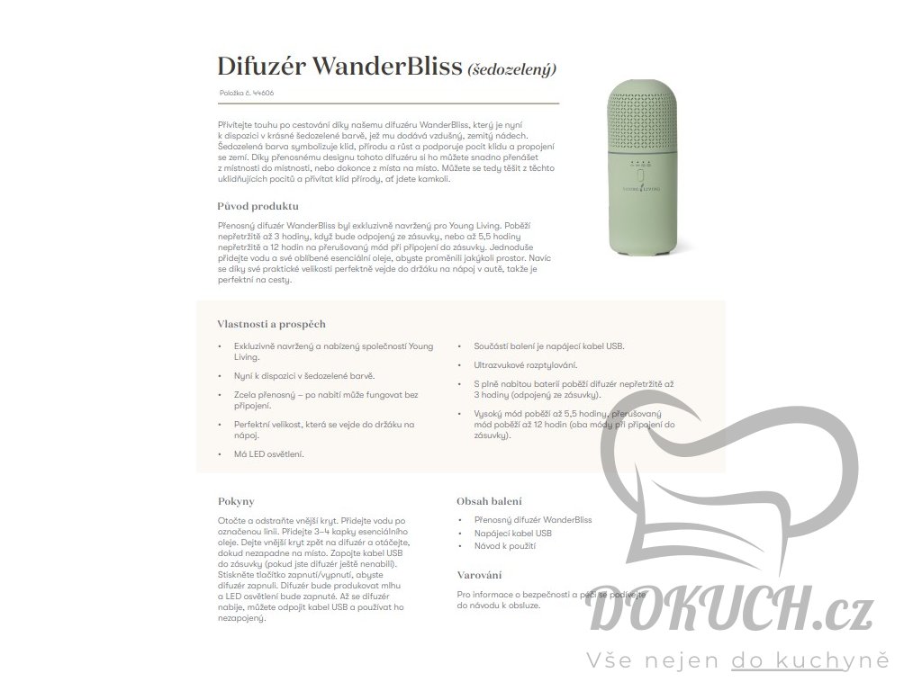 Přenosný difuzér WanderBliss byl exkluzivně navržený mód pro Young Living. Jednoduše přidejte vodu a své oblíbené esenciální oleje, abyste změnili jakýkoli prostor. Navíc se díky své praktické velikosti perfektně vejde do držáku na nápoj v autě, takže je perfektní na cestu. K podpoře soustředění na dlouhých cestách doporučujeme olej Peppermint.