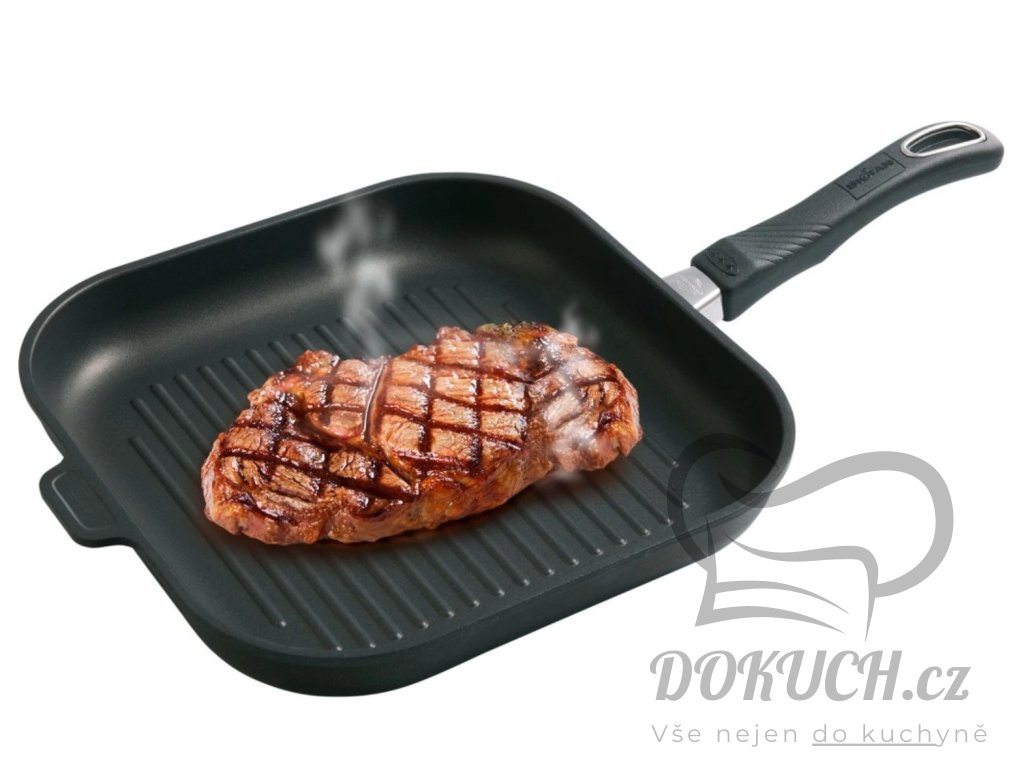 Grilovací pánev má oproti klasickým pánvičkám speciálně upravené dno. Vystouplé drážky udrží maso částečně ve vzduchu – není položeno celou plochou na pánvi a nepřipaluje se. Na steaku tak vznikne nejen efekt grilovací mřížky, ale také se napodobí samotná technologie grilování na horkém vzduchu. Šťáva z masa a případný tuk se udrží mezi drážkami, což je oproti klasickému grilování nad ohněm výhoda. Grilovat můžete samozřejmě také další pokrmy, zejména zeleninu. Použitím pokličky snížíte spotřebu energie.