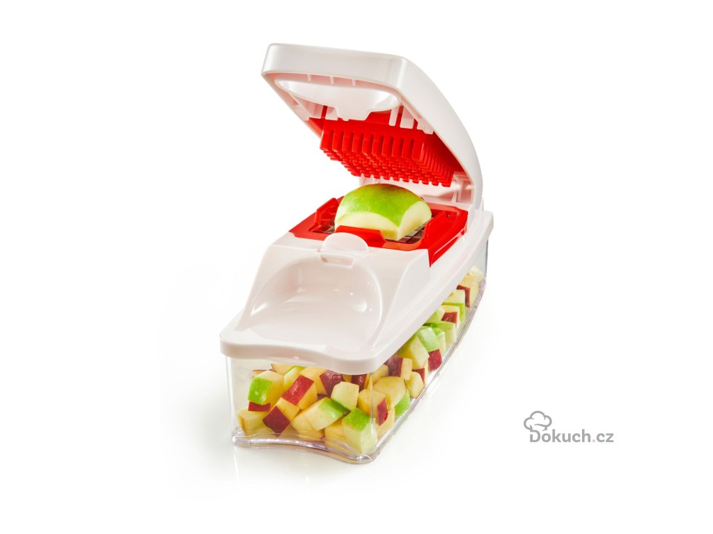 Spodní část tvoří nádoba z průhledného plastu, díky kterému máme vždy přehled, kolik suroviny již máme nakrájeno.