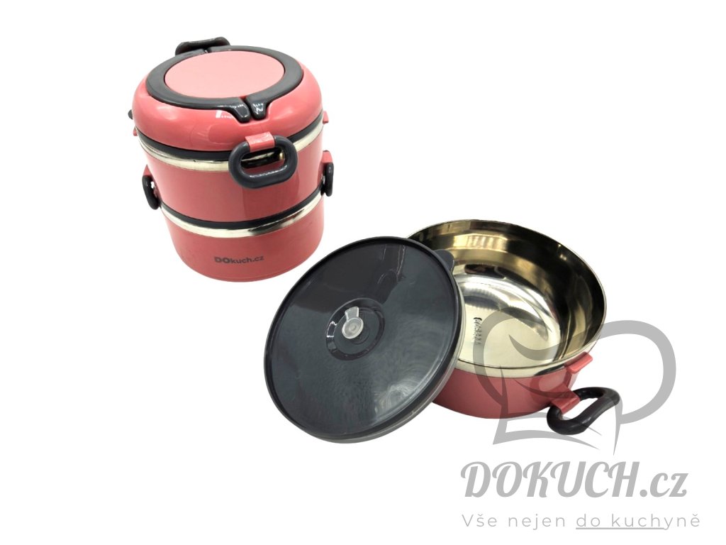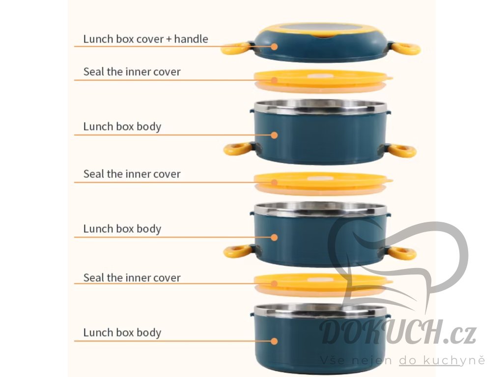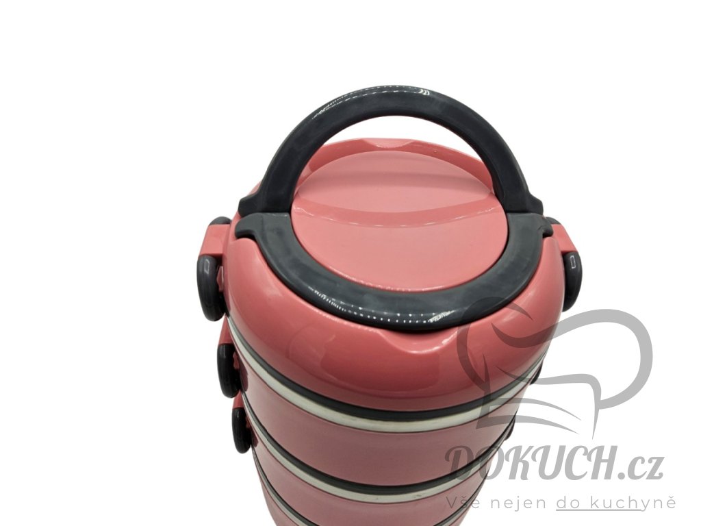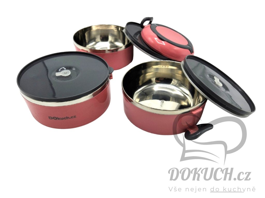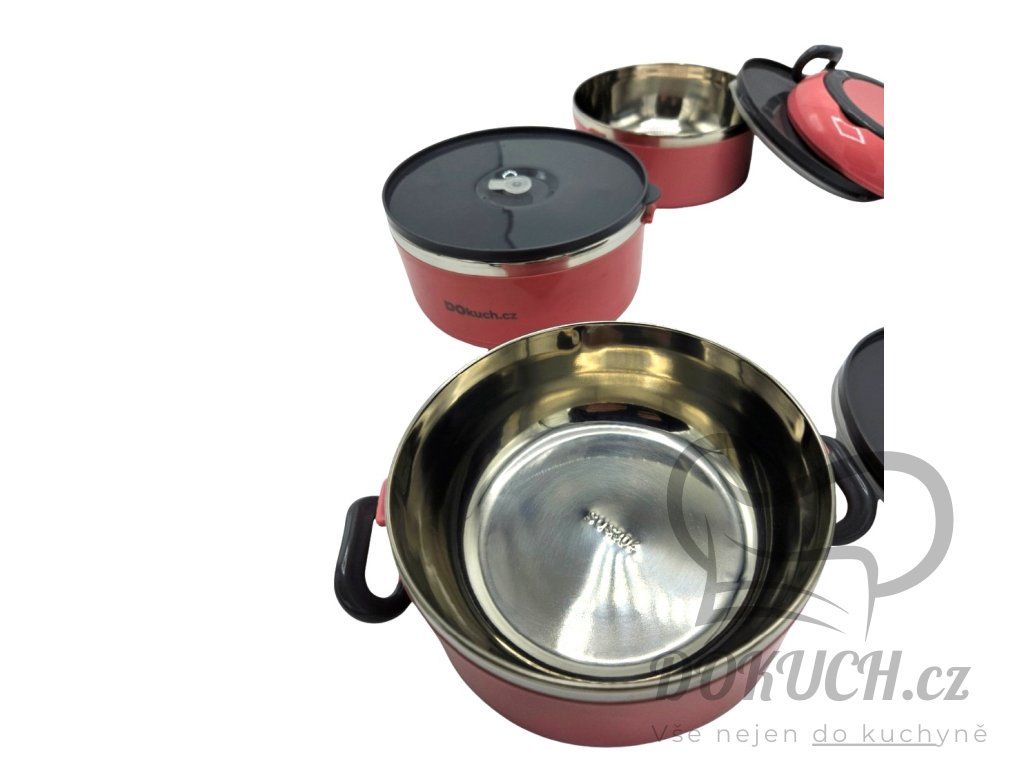 Sada nádob na přenos teplých pokrmů. každá nádoba má samostatné mezi víko se silikonovým ventilkem pro únik páry. Vrchní víko obsahuje sklopné rukojeti.