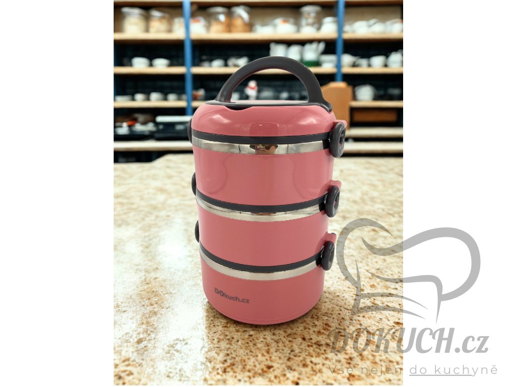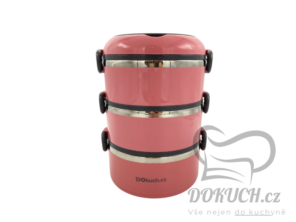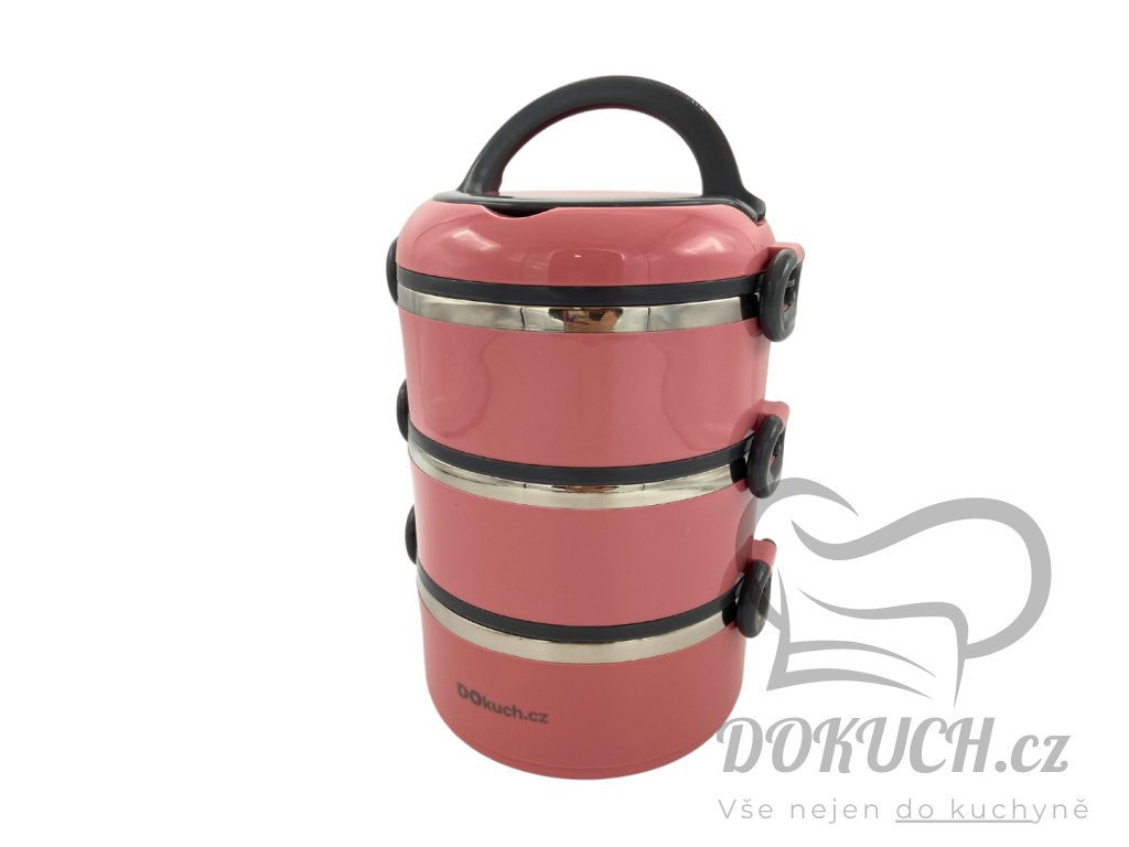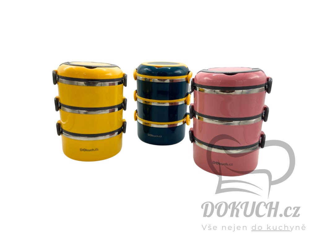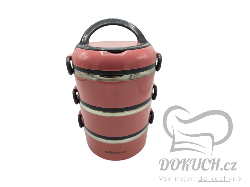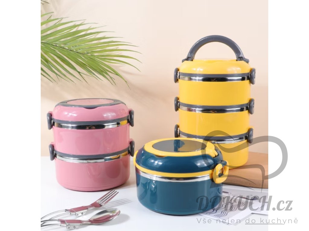 Sada nádob na přenos teplých pokrmů. každá nádoba má samostatné mezi víko se silikonovým ventilkem pro únik páry. Vrchní víko obsahuje sklopné rukojeti.