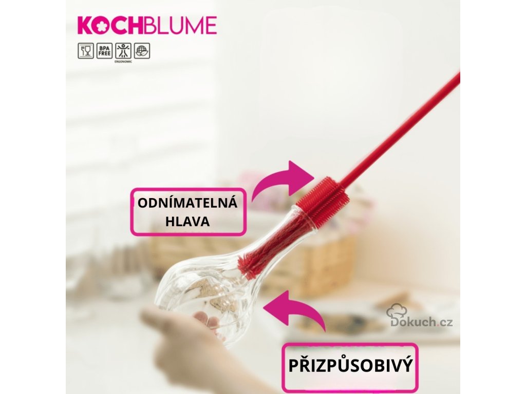Perfektně vyčistí láhve na pití, termosky, dětské lahvičky i karafy. Hlavice je odnímatelná a kompatibilní s dalšími kartáči Kochblume, takže můžete přizpůsobit délku i typ podle potřeby. Silikon je hygienický, rychle schne, neabsorbuje pachy a je maximálně šetrný ke sklu i dalším povrchům.