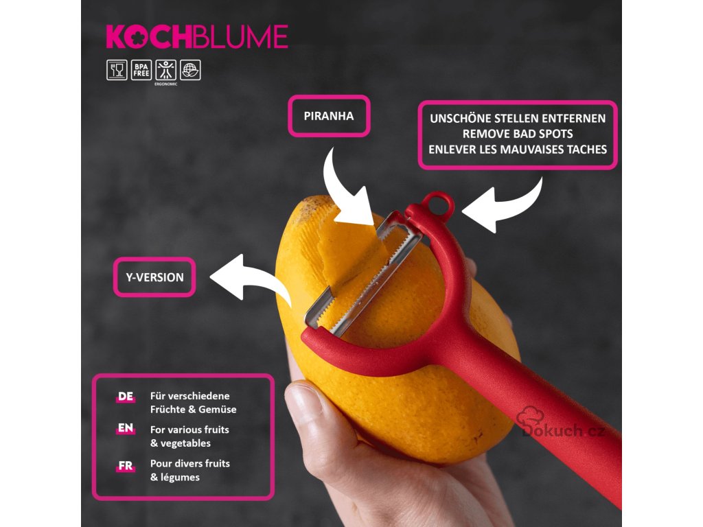 Horizontální škrabka - Y od značky Kochblume je chytrý kuchyňský pomocník, se kterým zvládnete loupání ovoce i zeleniny rychle, čistě a bezpečně. Extra ostrá čepel z nerezové oceli si snadno poradí s měkkými i tvrdšími slupkami.