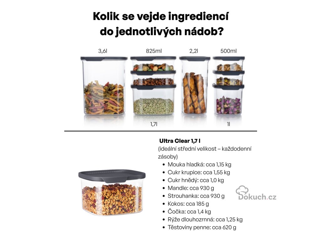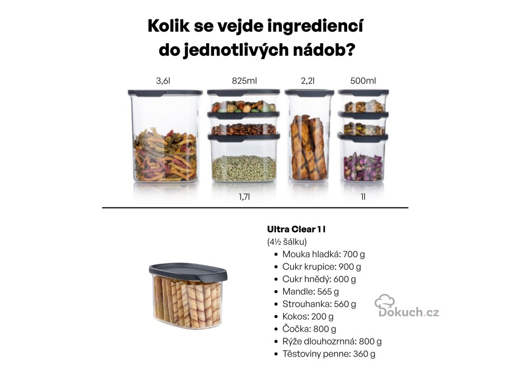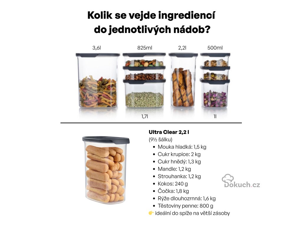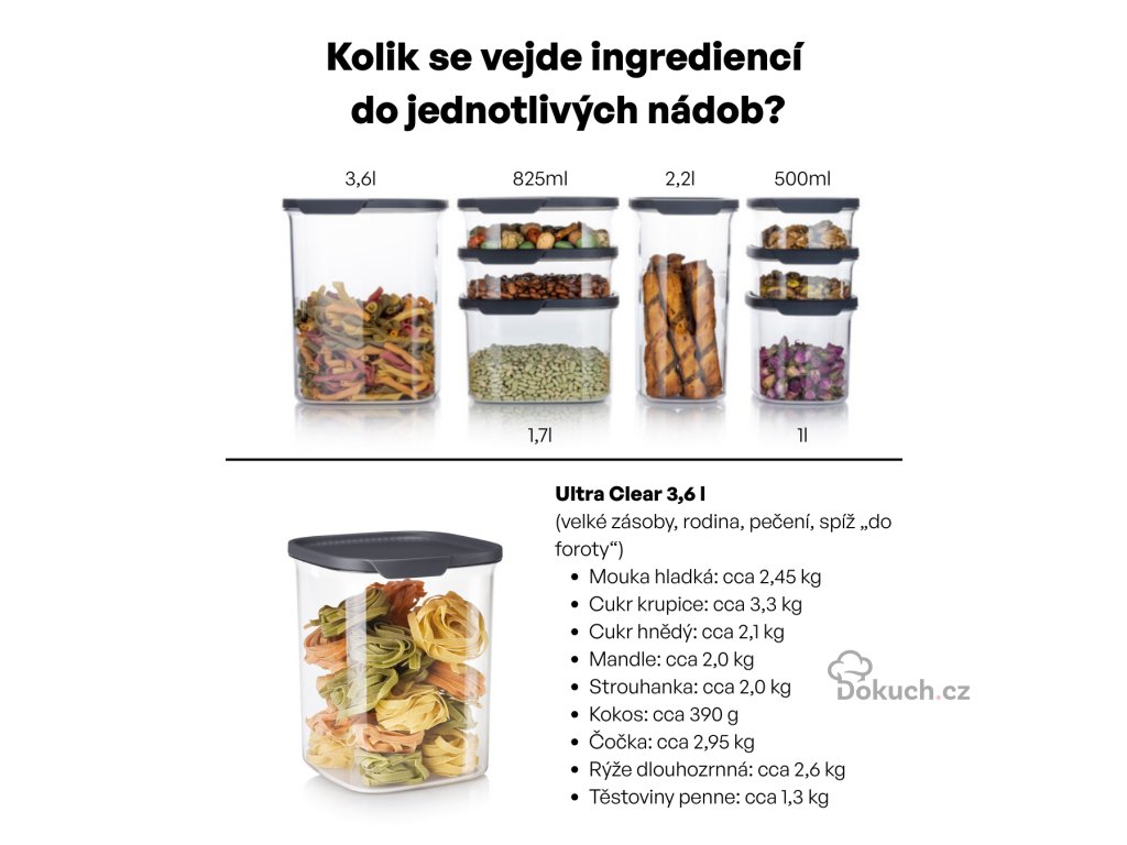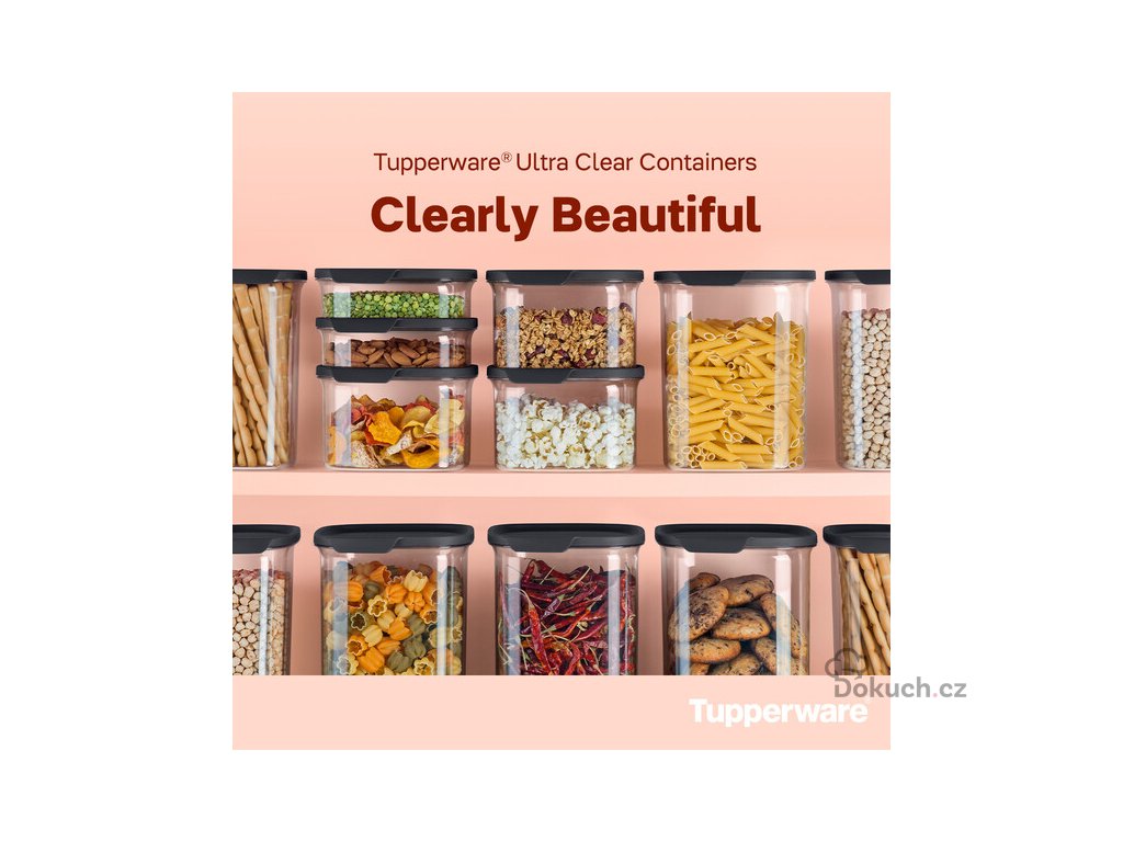 💡 Poznámka: Řada Ultra Clear navazuje na dříve oblíbené spížní dózy Tupperware, které si zákazníci pamatují pod názvem „Stále sypké“, a přináší je v moderním a elegantním provedení.