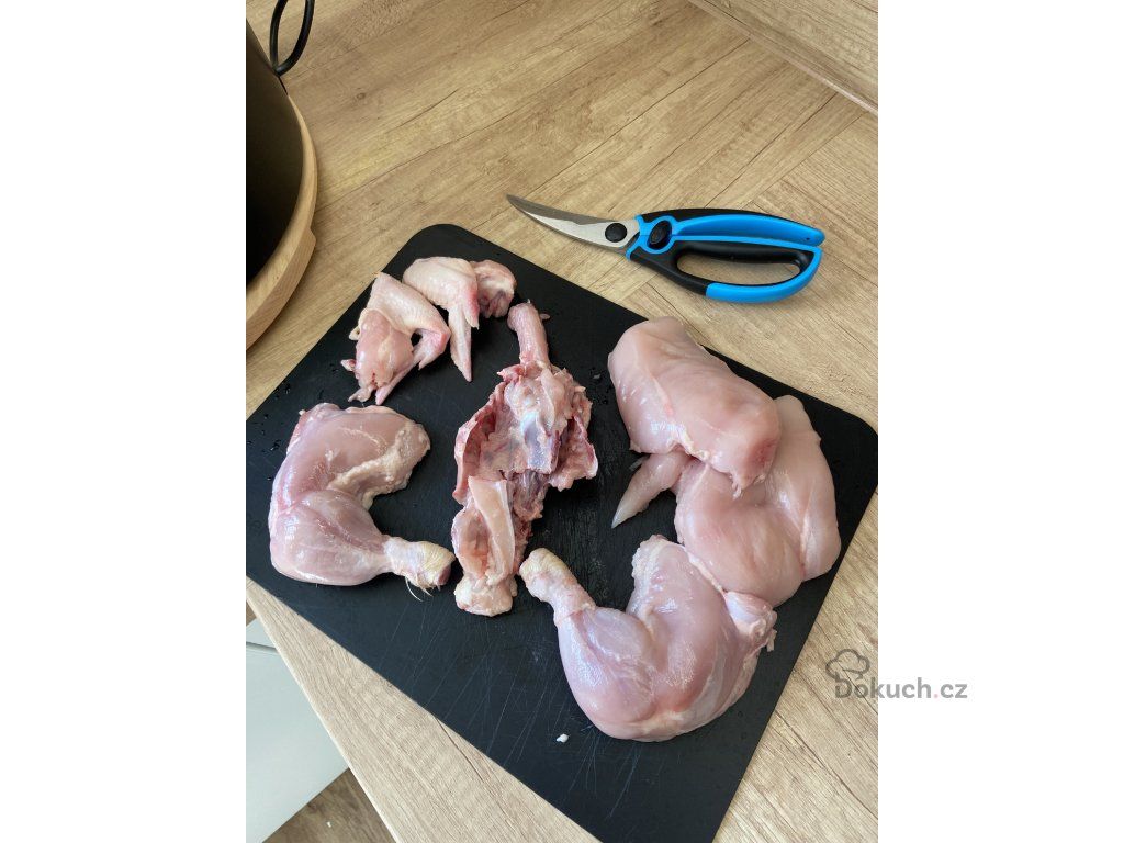- Pak odstřihněte křídla a rozstřihněte kuře ve směru páteře napůl.