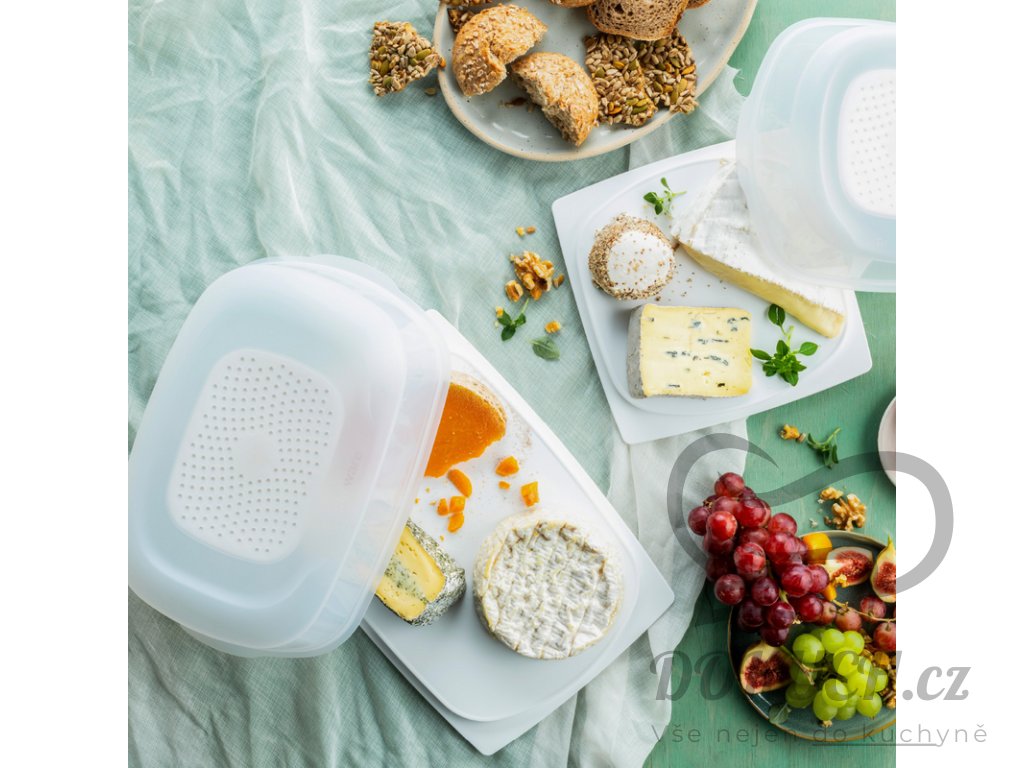 - Víko výrobku přiléhá těsně k podnosu, čímž je nejen optimalizována funkčnosti systému CondensControl, ale rovněž minimalizuje unikání sýrového zápachu do chladničky nebo naopak pronikání odéru ostatních potravin v chladničce do nádoby.