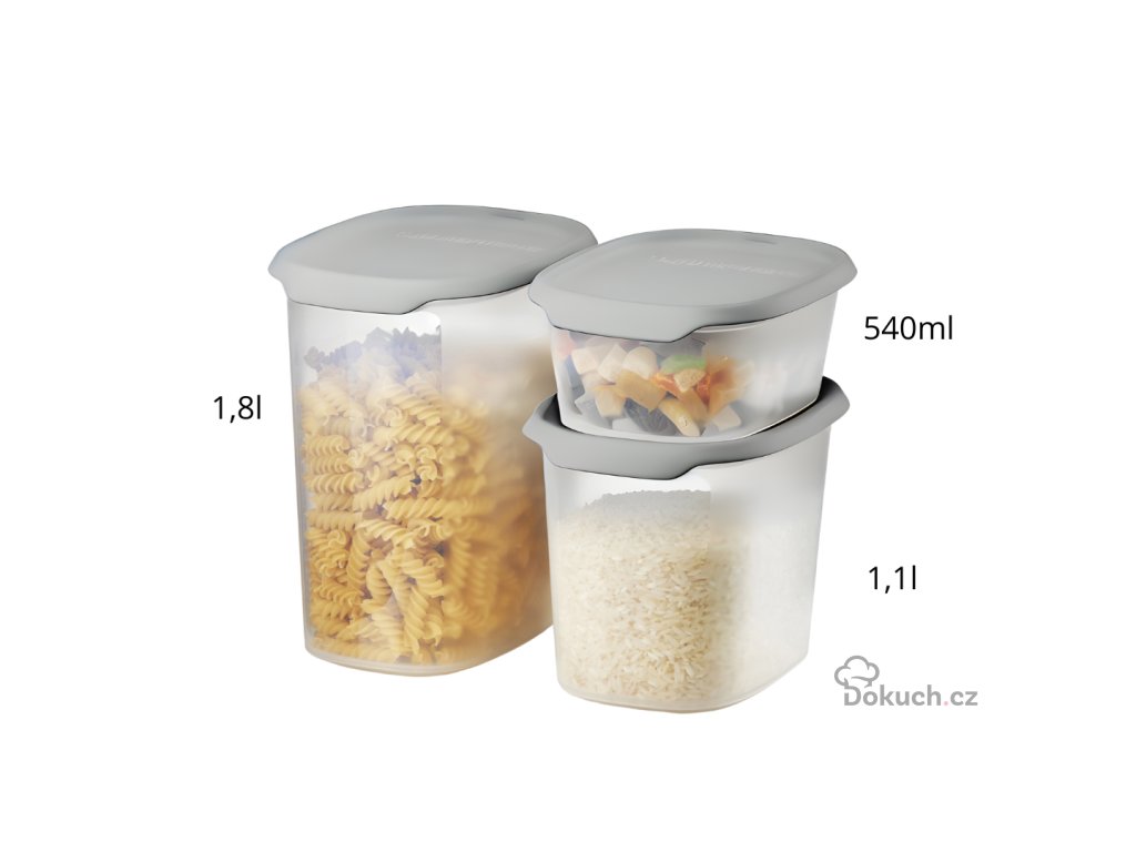 Všechny nádoby se prodávají jednotlivě. Tyto nádoby mají vždy šedé víko (Velikost 540ml / 1,1l / 1,8l)