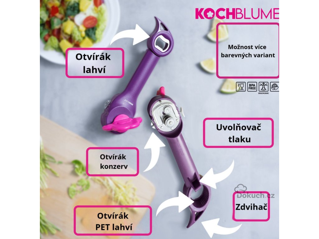 Tento nástroj kombinuje pět funkcí v jednom, a tím šetří místo ve vaší kuchyni. Žádné zbytečné množství nářadí – s tímto pomocníkem otevřete téměř vše.