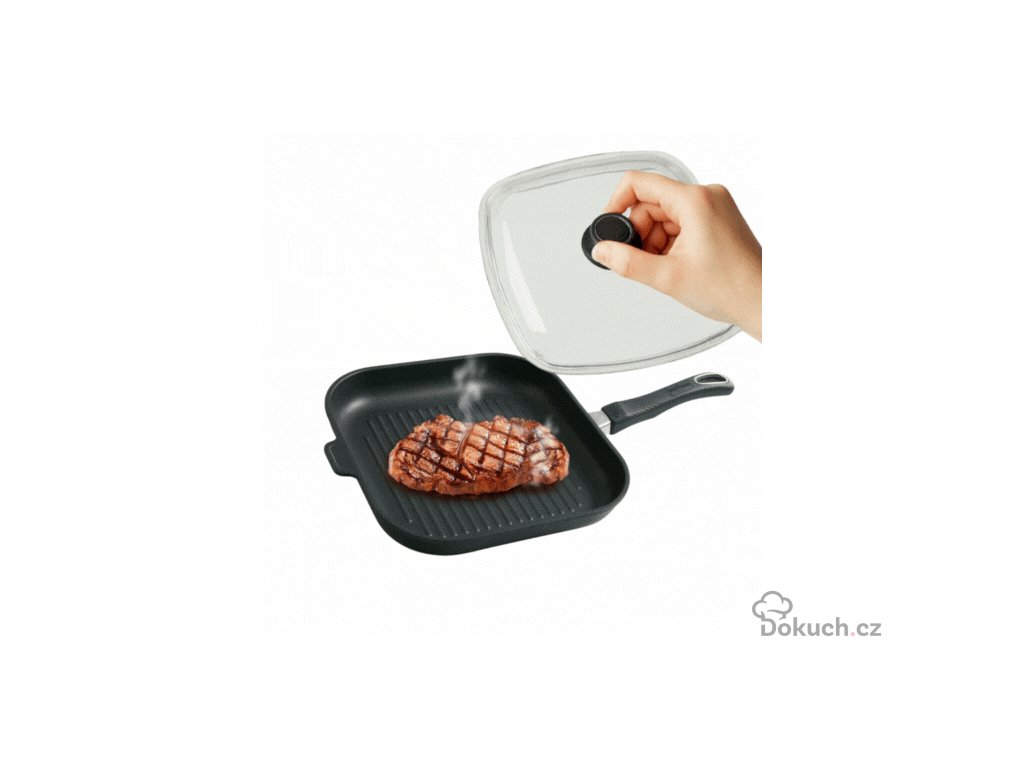 Žáruvzdorná skleněná poklice umožňuje pohodlně kontrolovat průběh vaření bez nadzvedávání a úniku tepla.