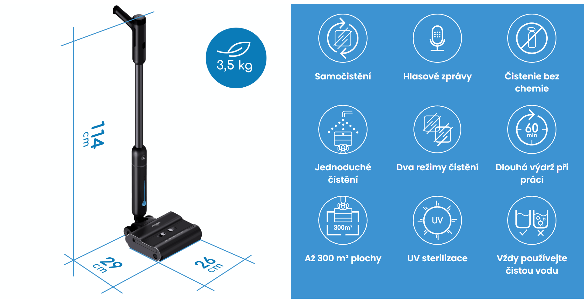 Jedno plné nabití stačí na důkladné vyčištění domácnosti o rozloze až 300 metrů čtverečních.