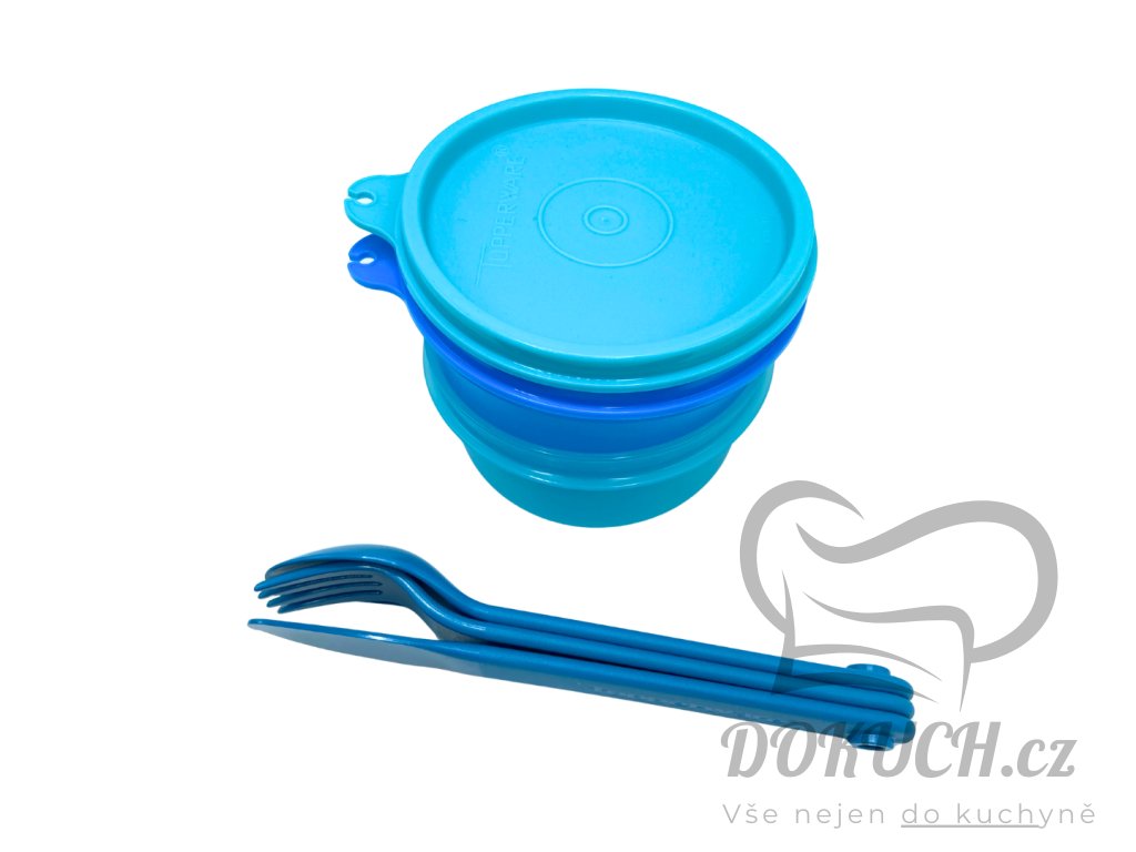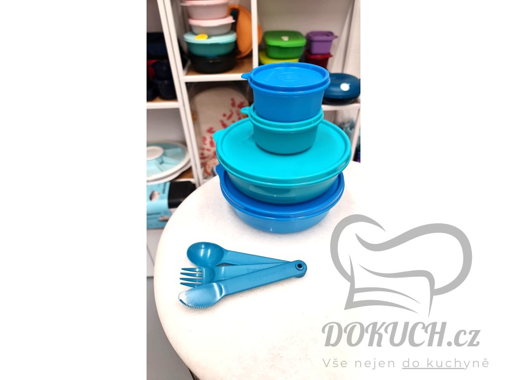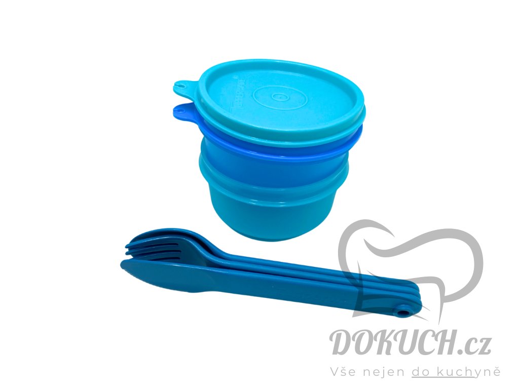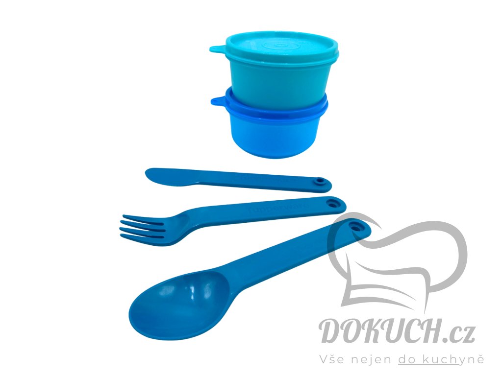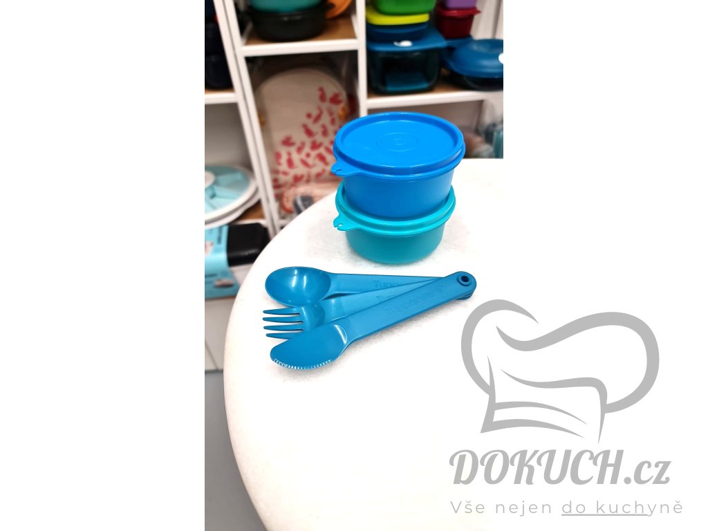 Obsahuje 3 malé nádoby (9,5 × 5 cm) z legendární řady Tupperware a opakovaně použitelný příbor – vidličku, nůž a lžíci, které jednoduše zacvaknete do sebe.