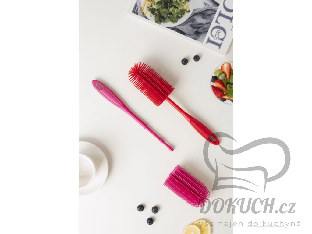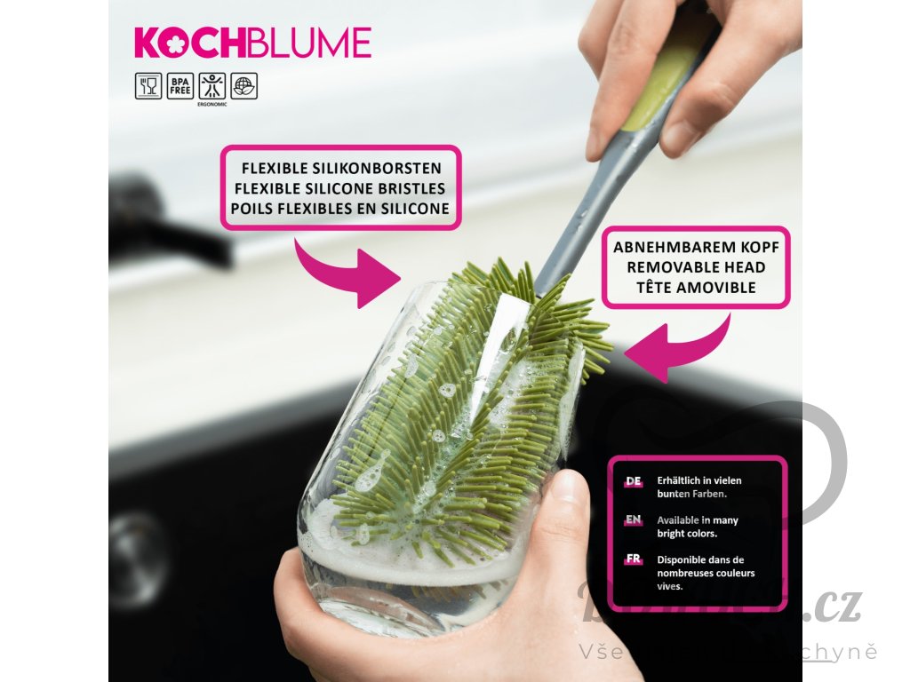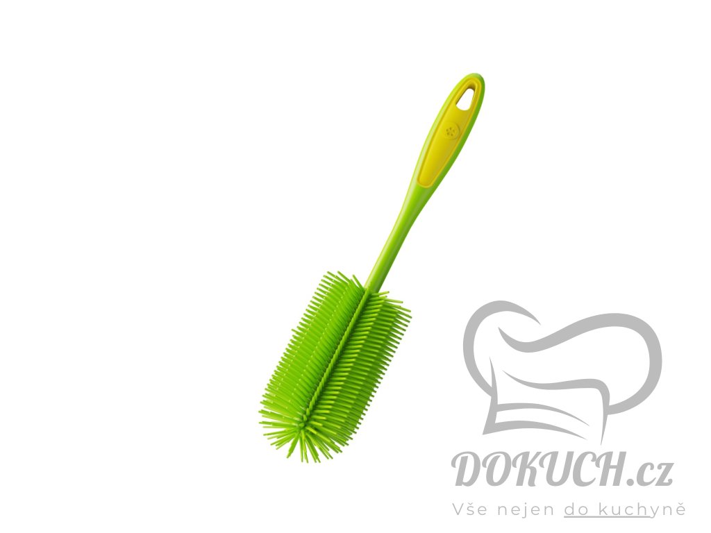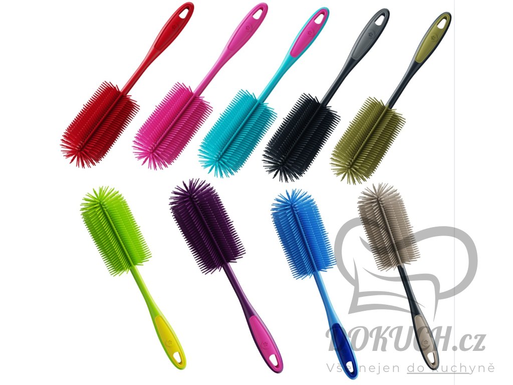 Tento kartáč na nádobí je ideální pro čištění nádobí, pánví, hrnců a sklenic. Je vyroben z materiálu bez BPA, je tepelně odolný až do 260 °C, díky čemuž je obzvláště odolný a bezpečný. Po použití jej lze snadno mýt v myčce nádobí, což zajišťuje hygienické čištění. S délkou 29 cm je praktický i účinný.