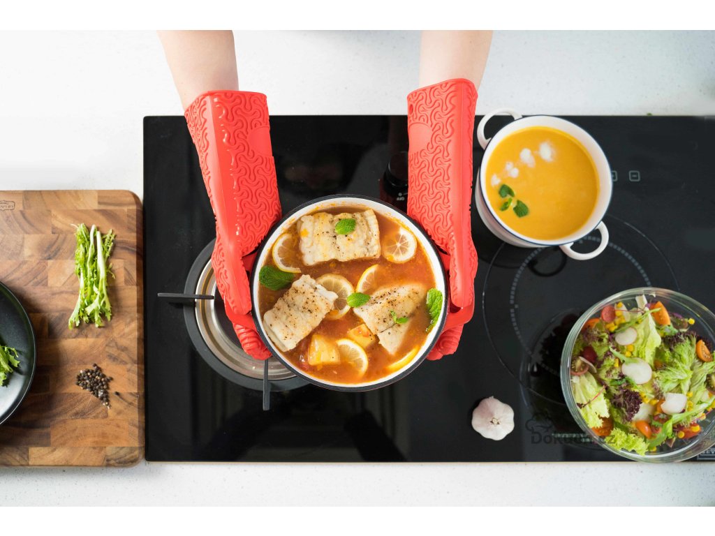 Rukavice chrání nejen ruce, ale i předloktí – jejich délka 30 cm je ideální při práci s hlubokými hrnci nebo při grilování. Vyrobené jsou z prvotřídního potravinářského silikonu bez BPA, takže jsou bezpečné pro kontakt s potravinami a zároveň extrémně odolné.