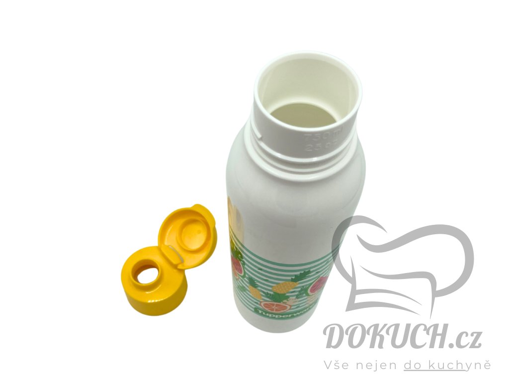 Odšroubujte víčko s použitím zarážky. Naplňte vodou nebo džusem a znovu uzavřete. Pak dejte vychladit do ledničky nebo přímo na stůl.